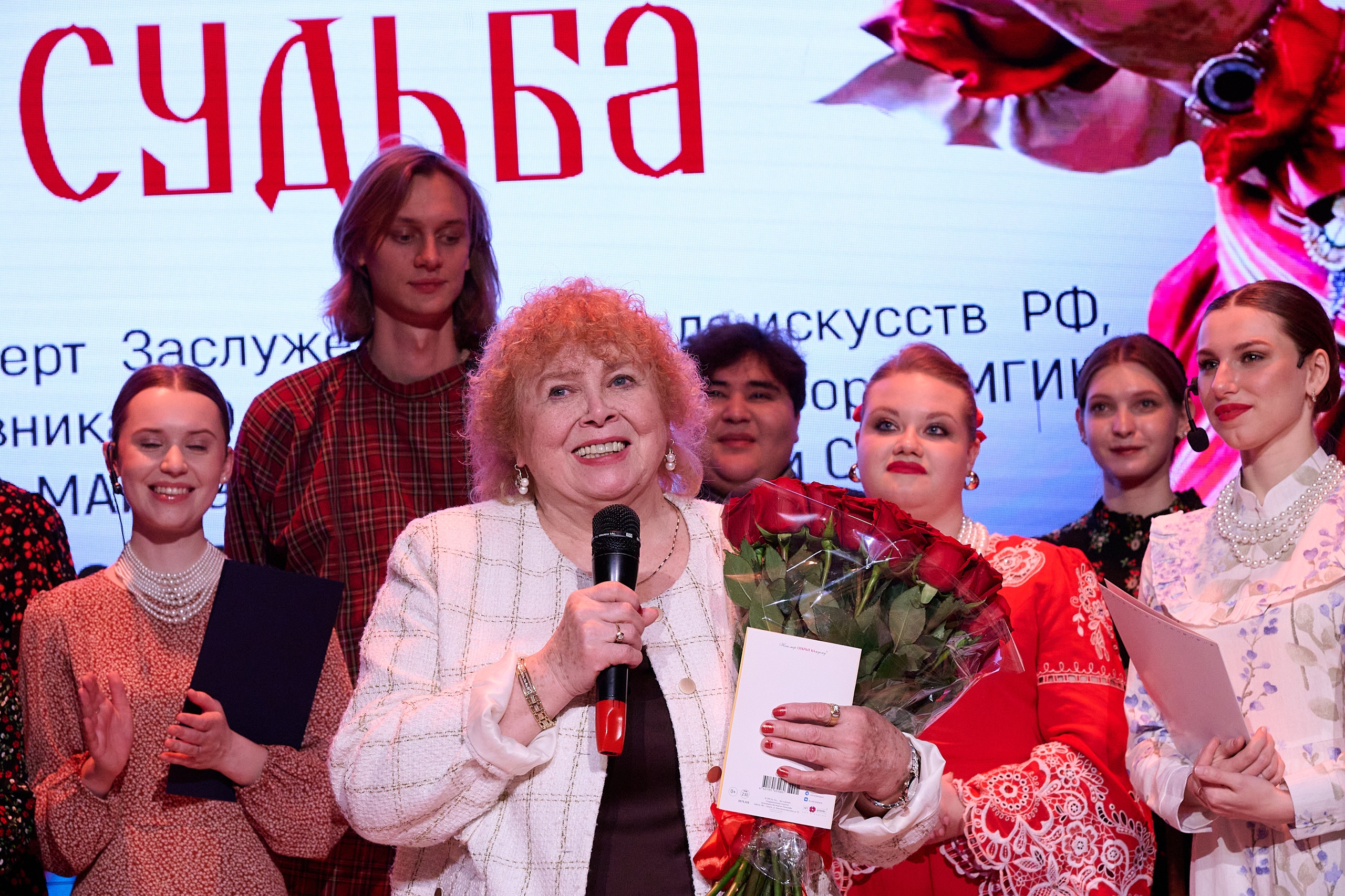 С поздравлением выступила заведующая кафедрой сольного и хорового народного пения РАМ им. Гнесиных, заслуженный работник высшей школы РФ Марина Васильевна Медведева, передав поздравительный адрес от ректора Российской академии музыки имени Гнесиных Александра Сергеевича Рыжинского.