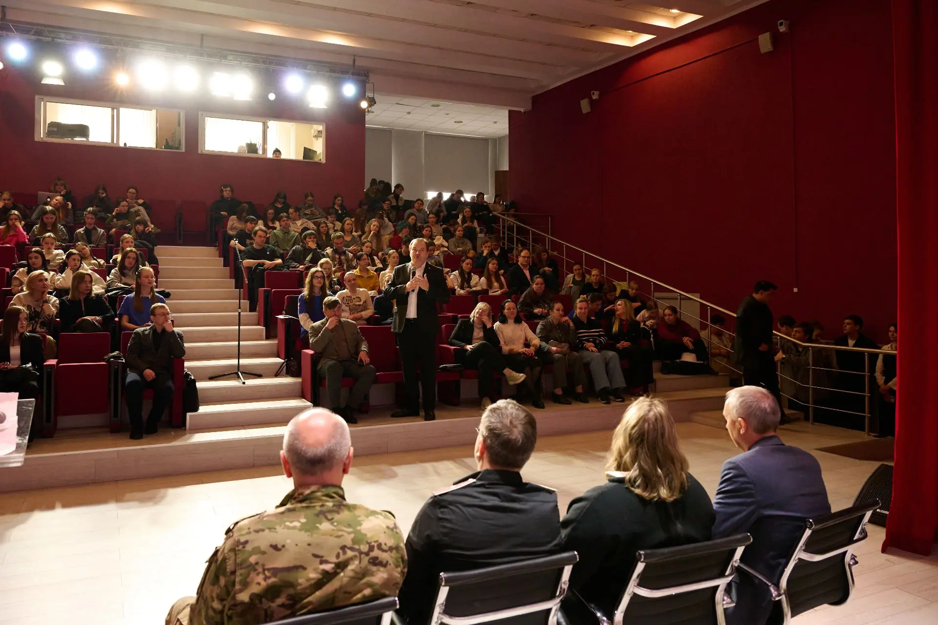 Одной из ключевых фигур встречи стал заместитель директора Департамента культуры Министерства обороны Российской Федерации, кавалер ордена Мужества Константин Станиславович Лещун. «Защитник Донбаса, который прополз линию боевого соприкосновения на коленках», — так он представил себя студентам. Константин Станиславович Лещун отметил: «В сегодняшнее тяжелое время для страны трудно отделить наши воинские будни от нашей культуры, потому что всю историю России – а история России – это во многом история войн – стержнем культуры была армейская культура. На армейской культуре, армейских песнях строился огромный пласт и театрального, и музыкального, и хореографического творчества. И радостно, когда в нашем искусстве сохраняется истинный культурный код, в культуре – наш дух. А духом куется победа!»